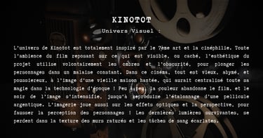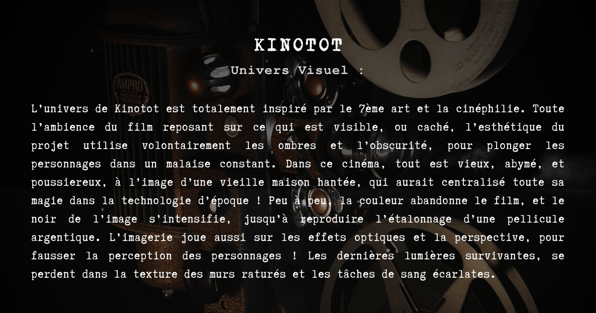 Pensé comme un hommage à toutes les nuances du cinéma horrifique, KINOTOT est un huit-clos fantastique méta, proposant une réflexion sur la cinéphilie, à travers le point de vue de la "génération sacrifiée". Dans cette histoire, nous suivons donc un groupe d'étudiants, pris en chasse par une puissance maléfique quasiment omnisciente, décidée à les éliminer au nom de l'art. Le film est en partie inspiré d'une mauvaise expérience personnelle, à laquelle viennent se greffer de nombreuses inspirations cinématographiques. Les références y sont nombreuses, utilisées comme un véritable langage codifié. Celles et ceux qui parviennent à le déchiffrer pourrons peut-être s'échapper.