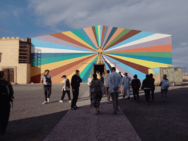 Notre chauffeur fait une nouvelle pause à Zagora, une oasis qui servait autrefois de point stratégique. Fondée au Moyen-Âge par les Saadiens, cette ancienne forteresse servait à contrôler le commerce saharien, et vit naitre cette dynastie, qui s'en servait aussi de point de départ de caravanes. Le temps de récupérer de l'eau et de l'essence, nous en avons profité pour nous dégourdir les jambes. Bien sûr, cela signifie pour moi d'aller admirer la beauté de l'art oriental, car la Grande Mosquée Amzrou m'a tapé dans l'œil ! En m'arrêtant sur la mosaïque entourant ses portes, je remarque qu'un code couleur semble y régner. Je m'empresse de demander à un vieillard local si ces motifs et couleurs ont une signification particulière. J'avais vu juste ! Il me reconduit vers un guide non loin, qui m'en explique le sens. Ainsi, j'apprend que la mosaïque marocaine est née à Fez, et que ses couleurs symbolisent les trésors naturels du pays (vert pour la végétation, bleu pour l'eau et le ciel, rouge pour la terre, etc).