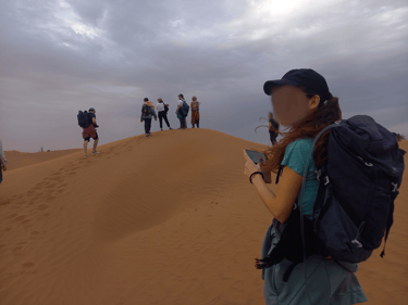 Avouez, on est nombreux à vouloir chevaucher un dromadaire ... Dès que Mustafa a traduit la proposition des chamelier, nous autorisant à monter leur camélidés ; j'était comme un enfant un matin de Noël. Claire a le privilège de monter Drodro, mais ma monture est tout aussi bien ... nous faisons le tour des dunes voisines, dans un petit circuit, mais le plaisir est là. Tout le monde y passe, et je trouve un excellent spot pour photographier mes camarades à la lueur du crépuscule. Pour les passionnés d'équitation, monter est un dromadaire c'est plus sportif qu'un cheval ! L'effet montagne russe est présent. J'ai beau m'accrocher au guidon, je suis balancé de tous les côté. Je me contente d'une photo à bord, et profite du moment en lâchant un peu le portable.