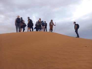 Jusqu'ici, nous avions vu et traversé nombre de paysage. Mais ce que j'imaginais lorsqu'on me présenta un treck dans le Sahara, se réalisa précisément ce jour-ci ! Et une activité que je voulais faire depuis des années, une idée qui avait germé dans mon esprit, depuis la première fois que j'ai vu ces créatures en photo ... se fit également. Précisément, au moment où je n'y comptais plus. Durant tout le treck, je n'avais osé le demander. Ni à Mustafa, ni aux chameliers. Je voulais seulement profiter du moment présent, sans déranger le groupe pour un caprice éphémère.