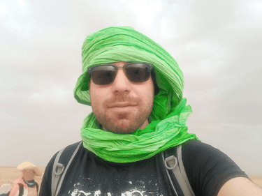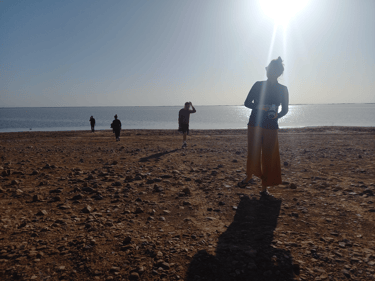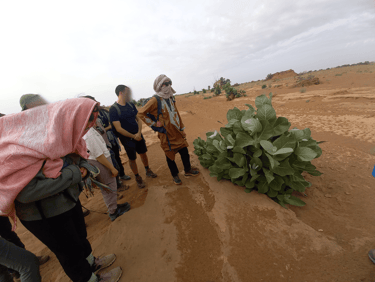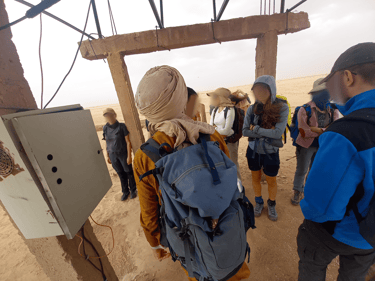Après une bonne heure à longer les petites dunes, nous entrons dans une zone où la végétation se raréfie. Mustafa nous conduit jusqu'à un puit à énergie solaire, qui semble abandonné, bien que de l'eau stagnante s'y trouve. Le terain est tellement plat, que l'on voit des éléments à des kilomètres de distance. Ainsi, j'apprend que le seul bâtiment présent autour de nous, si loin qu'il nous apparait avec la taille d'une fourmi, est en fait une école. Nous repartons ensuite vers le camp, en bravant le vent qui transporte du sable. Mais en enroulant mon cheich autour de ma tête, j'arrive à me créer une protection à la fois légère et efficace. Je ressemble à l'homme invisible (version James Whale), mais le tissu en lin est parfait pour voir à travers les mailles !