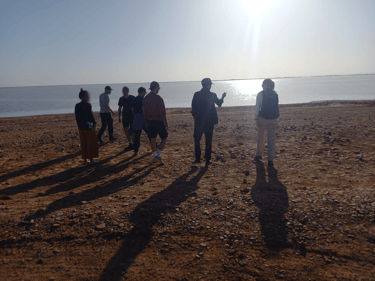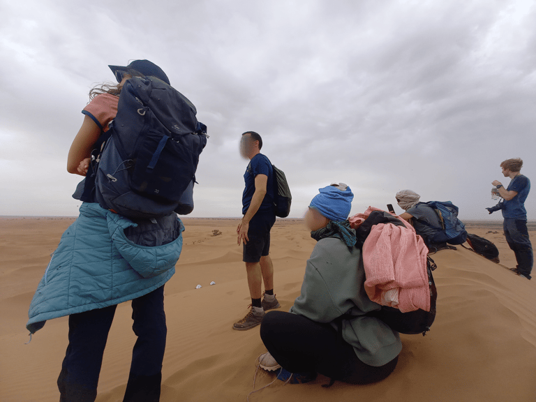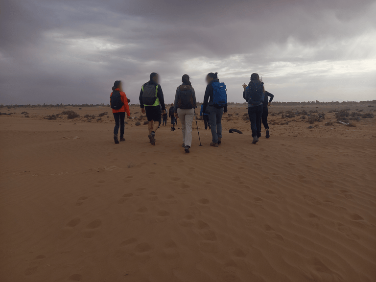 Probablement à cause de ma nuit, je reste un peu en retrait du groupe ce matin. Le temps gris quasi constant n'aide pas. J'ai miraculeusement réussi à éviter les ampoule, ce qui n'est pas le cas de Perrine. En revanche c'est la deuxième fois que mes lunettes cassent en plein désert ! Heureusement que Camille a du ruban adhésif avec elle ... c'est bricolé, mais ça tiendra. La marche est plus tranquille que la veille ; rester à l'arrière du groupe me permet d'y aller doucement. Claire et moi discutons de la langue Arabe, qu'elle a commencé à étudier, mais aussi de ses voyages précédents et de la place des femmes au moyen-orient.