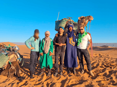 Dernière matinée dans le désert. L'émotion est présente ... dès que nos sacs sont emballés, tout le monde se réunis autour des chameliers pour la photo de groupe. Mustafa, Ibrahim rejoignent le tableau, et même Drodro ! La photo n'aurait pas été réussie sans la mascotte officielle du voyage ... mon camélidé préféré. Chacun de nous fait une photo personnalisé avec notre super équipe, et nous embarquons les sacs dans les véhicules de la cie Treck des Gazelles (le surnom qu'Ibrahim donnait aux voyageuses).