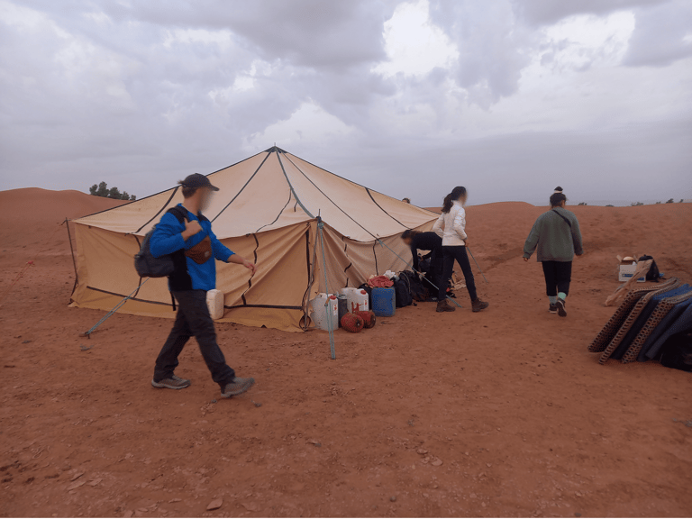 Après cette longue marche, nous arrivons dans ce que je pense être le "Camp Chegaga Chez le Pacha" ... un lieu de bivouac sédentaire. Autant dire que pour un treck, c'est toujours bienvenu de retrouver un peu de confort avec l'effort. Mustafa nous a gentiment payé des boissons au comptoir, et tous ensemble, nous échangeons sur notre voyage. La fin se rapproche peu à peu.