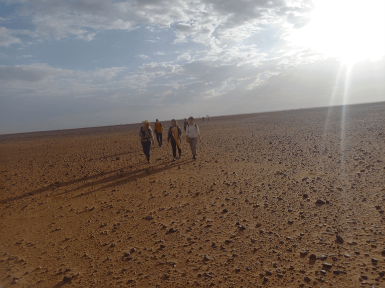 La zone que nous traversons à présent est particulièrement rocailleuse. Le temps d'une pause, Mustafa nous propose de manger quelques dattes qu'il a acheté avant le treck. Elles étaient délicieuses, bien meilleures que celle vendues en France ... Nous marquons plusieurs arrêt en route, et je commence à trouver le temps long. Il y a toujours une bonne entente dans le groupe, mais je crois que les dunes nous manquent. Ce reg n'en finis pas. Je ne l'avais pas réalisé, mais un terrain sans relief + une météo grise + les pierres qui pimentent la marche ... tout cela commence à m'affecter. Même je passe tout de même un bon moment.