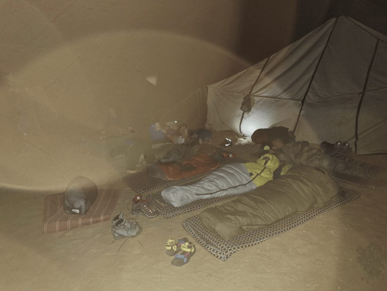 Mais pour la nuit (qui pouvais être très fraiche !), je portais un t-shirt (manches longues) en coton, un pantalon de jogging, couplés à des vêtements thermiques, et parfois un sweat à capuche. Je dormais en chaussette d'hiver, car le sable peut être froid.