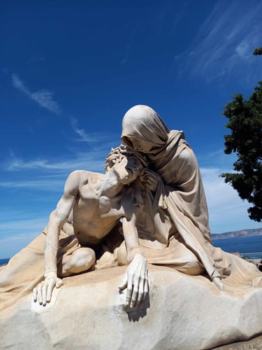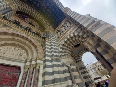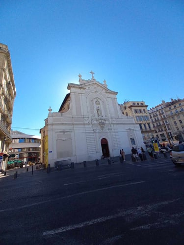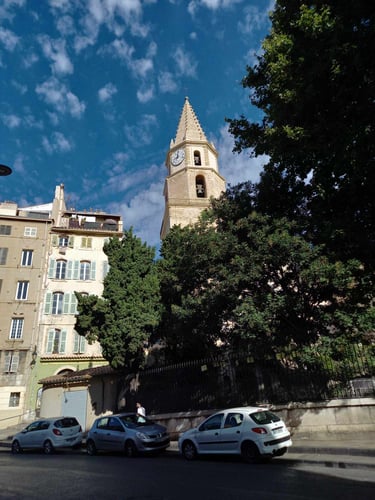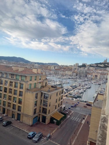 Honnêtement, le quartier de la gare Marseille Saint Charles, dans le centre ville, est à l'image du cliché que l'on associe à la ville. Oui, je l'avoue, à mon arrivée, j'ai trouvé des rues sales, bruyante, et surpeuplées. Mais au bout de 5 minutes de marche vers mon Airbnb, la ville a révélé son vrai visage ! Mon logement se trouvait à proximité du vieux port, et offrait donc, depuis le portail, une magnifique vue sur la cathédrale la plus célèbre de Marseille. Mais mon repère à moi, c'était cette superbe statue de sirène qui ornait le coin de l'immeuble voisin. Le temps de m'installer et hop, je part rejoindre Yanis.