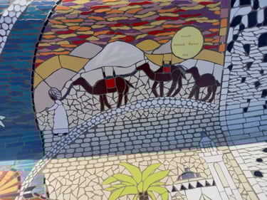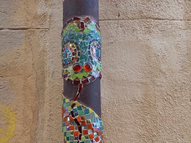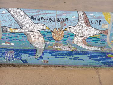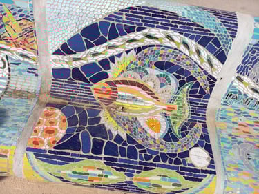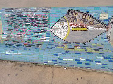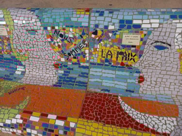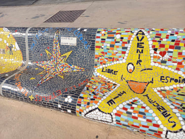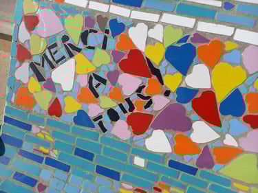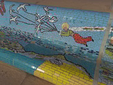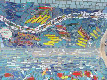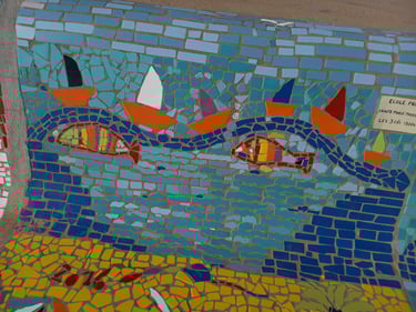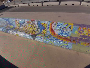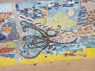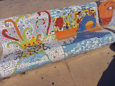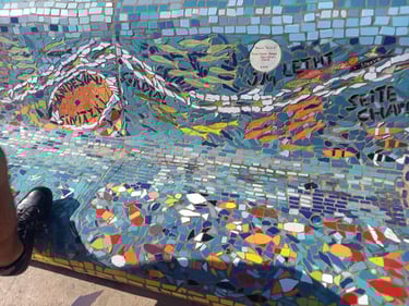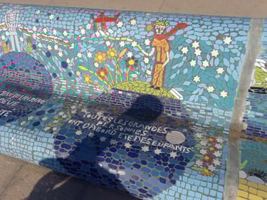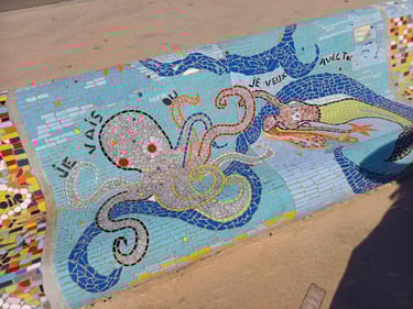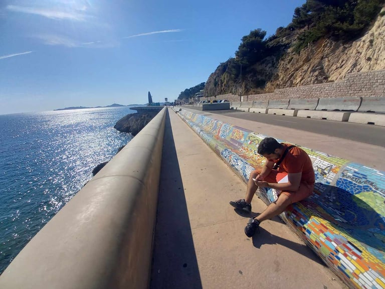 Je vous vois venir avec vos doutes ... Mais enfin Loïs, quel est ce trésor que tu nous a vendu ? La mer c'est sympa, mais on connais. Et bien jetons un œil à cette sublime mosaïque sur laquelle Yanis est assis. Quoi de plus normal, car rien de tel qu'une petite pause avant de reprendre notre marche en plein soleil. Sur toute l'étendue de la corniche, l'immensément longue et unique assise est recouverte de céramiques colorées. C'est le fruit du travail de l'association Viv'Arthe, qui, soutenue par les entreprises locales, a pu construire ce projet purement artistique avec les enfants du quartier et les personnes en situation de handicap. Un bel hommage à la ville elle-même, parfaite représentation, selon moi, de l'âme de Marseille.