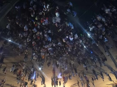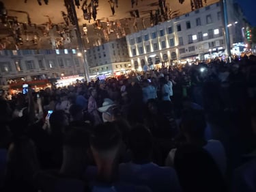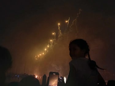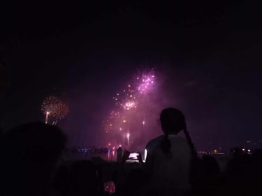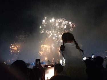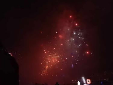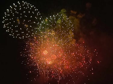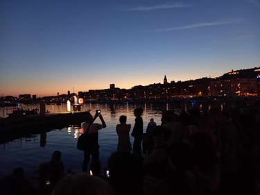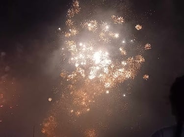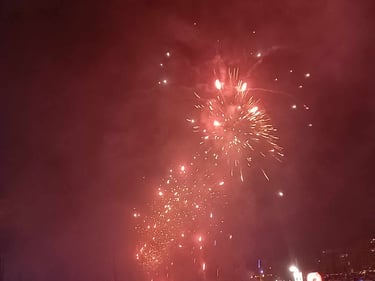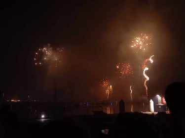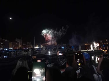 Enfin, après cette longue marche au soleil, aussi épuisante que magnifique, chacun est rentré chez lui, le temps de manger et de se changer pour l'évènement de la soirée. Comme de coutume, le soir du 14 juillet, un feu d'artifice fut lancé depuis le port. Il y avait foule sur le quais, rassemblés sous l'ombrière, touristes et locaux s'étaient réunis pour admirer le spectacle, qui tardait à démarrer. Un groupe d'imbéciles s'amusait à faire exploser des pétards au milieu de la foule. Malgré ça, l'ambiance était festive, grâce aux musiciens jouant les airs de leurs pays d'origine. Nous nous sommes placés au bord du quais, au milieu des habitants, quand le spectacle commença enfin ! On en a bien profité, malgré la vue gênée par nos voisins. Mais au moins, l'enfant devant moi eu droit à un feu d'artifice digne de ce nom.