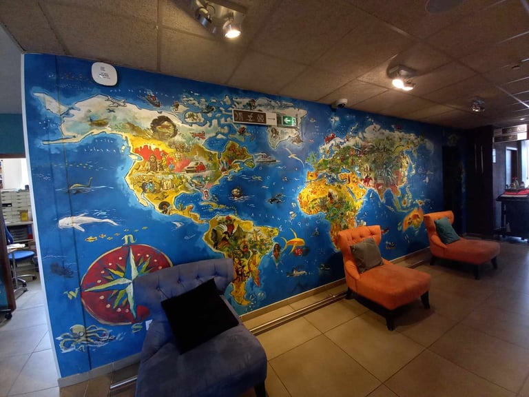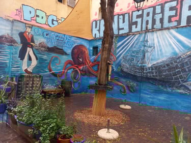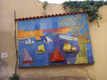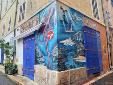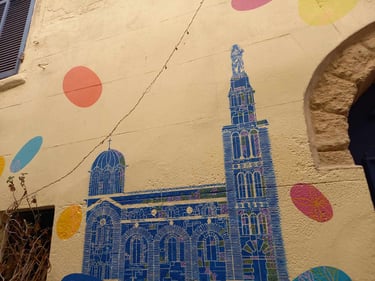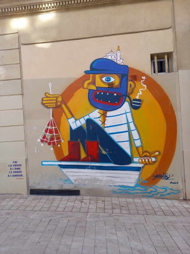 Quand à cette belle fresque et ses bateaux, sur le mur d'enceinte de l'église des accoules (église chargée d'histoire, dont il ne reste plus que le clocher actuellement), elle est l'œuvre des enfants du quartier du Panier, sous la supervision de l'artiste Andreina baldo Flesia (soutenu par l'assos "Paroles d'Enfants" et "Lions Club Marseille terre du sud").