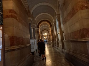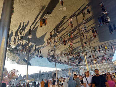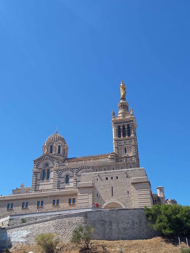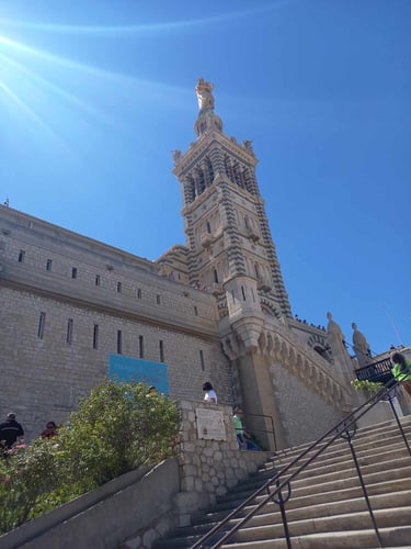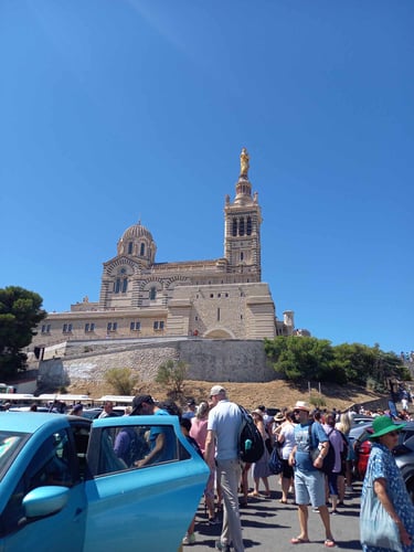 j'ai retrouvé Yanis sous l'ombrière (l'énorme miroir retourné au centre du vieux port, proche du métro), et nous avons pris le bus pour rejoindre la Basilique Notre-Dame de la Garde, le plus beau monument de Marseille ! Nous y étions dès l'ouverture, mais les touristes affluaient déjà par centaines ... Cela dit, la plupart étaient calmes et respectueux. Cela m'a donc bien moins gêné que lors de mon passage à Paris en 2022. Autre paramètre : La vue sur la ville depuis la colline est splendide !