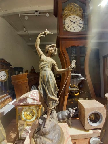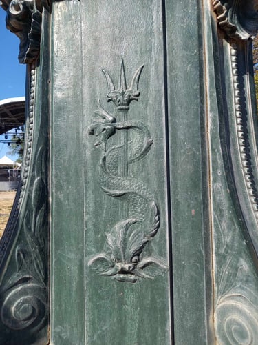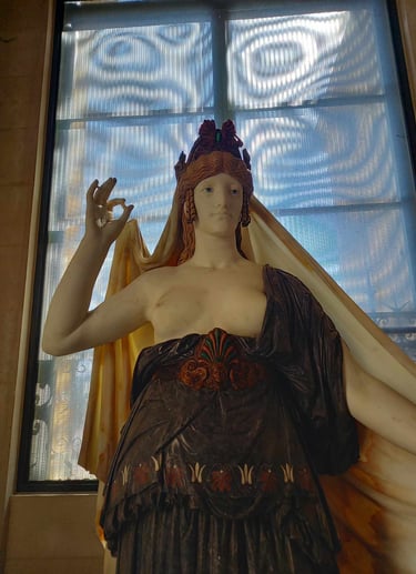 Alors pourquoi je vous en parle ? Vous l'aurez peut-être remarqué mais cette statue est en couleur ! Et plus que sa poitrine nue, c'est bien cela qui a dérangé les conventions lors de sa conception. Cette touche esthétique décorative est due à la polychromie, une nouvelle technique du milieu 19ème siècle, qui fit polémique, avant d'intégrer la mode du second empire (notamment grâce au symbolisme et à l'art nouveau, très porté sur la couleur). Marbres blanc, vert, jaune, albâtre, malachite, métal émaillé, pierre ... un tel mix, ça méritait bien un petit cours d'art non ?