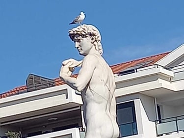 Je pris quelques photos, mais je n'ai pas grand chose à dire sur ces zones. Malheureusement pour les fan de foot, le stade qui s'y trouvait n'avait aucun intérêt pour moi ! Contrairement à cette mouette posée sur la statue de David (adversaire de Goliath dans la bible), réplique parfaite du chef-d'œuvre de Michel-Ange, qui sert de point de ralliement aux locaux pour aller à la plage. Cette statue fut offerte à la ville par Jules Cantini en 1903, qui travaillera plus tard, sur le chantier de Notre Dame de la Garde (visité la veille) et de la Cathédrale de la Major (découverte lors de mon deuxième voyage à Marseille, voir plus bas).