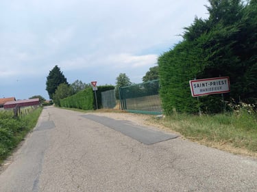 Pendant la marche, au bout des premières heures, je commençais à me lasser, malgré les paysages verdoyants qui m'entouraient. Je tombais parfois sur des surprises ou des détails insolites, mais la plupart du temps, j'avais la route et le soleil pour seul divertissement. Cela dit, je ne m'en plaint pas, parce que j'ai connu pire (voir le retour de Barcelone). Mon petit plus, ce fut un enclos où plusieurs chevaux pâtissaient, malgré les mouches qui les assaillaient. C'est après cette rencontre que je me suis trompé de chemin, une simple erreur d'inattention après un rond point, et 5 minutes plus tard, je me suis retrouvé au milieu d'une commune anonyme sans aucun repère ni indications. heureusement que j'ai fini par croiser un retraité qui m'a indiqué la direction de Lyon. C'est reparti pour 1 heure de marche ... Enfin, après ça, me voilà en terrain connu, je débarque à Saint Priest.