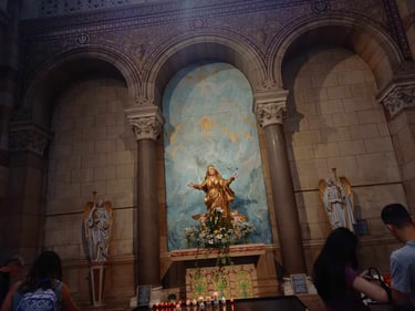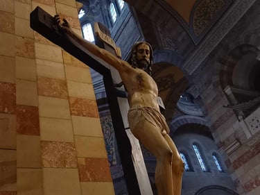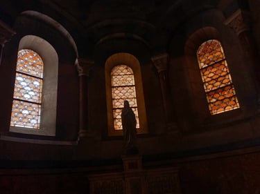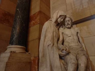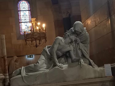 Sans être un expert, je peut me vanter d'avoir visité beaucoup d'édifices religieux, mais celui-ci est définitivement mon favori ! A l'intérieur comme à l'extérieur, ce monument est tant imbibé d'histoire, que son atmosphère nous plonge dans une autre époque. Je suis particulièrement sensible à cette statue d'inspiration romantique et datant de 1902. Elle est signée Auguste Carli, et représente Jesus et Séraphia, alias Sainte-Véronique (Sainte-Véronique aurait essuyé la face du Christ avec un linge, et découvrit alors que le visage de celui-ci s’était imprimé dessus. Véronique signifie "image ou icône véritable", Sainte-Véronique est donc la patronne des lingères et des photographes !)