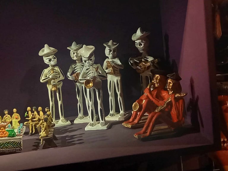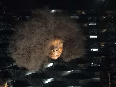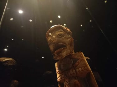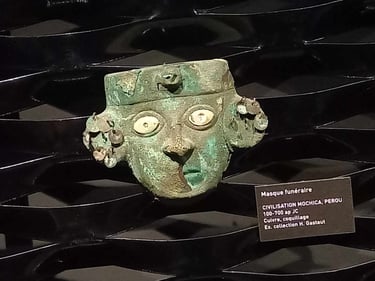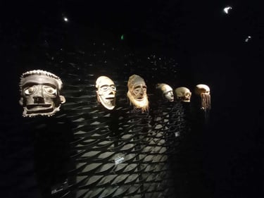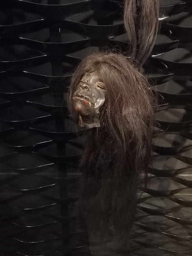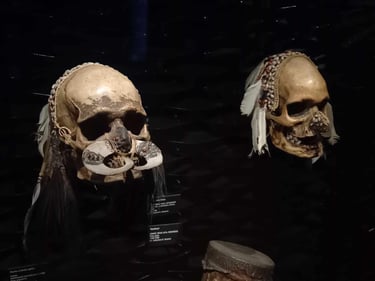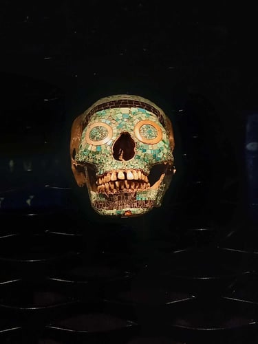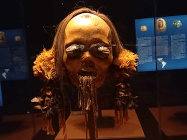 Vous allez surement me trouver bizarre, voir morbide, mais depuis ma visite des catacombes de Paris, j'ai une grande attirance pour les objets funèbre et tout de qui a attrait à la mort en général ... en même fallait s'y attendre de la part d'un mec qui a grandi avec les films de Tim Burton, les livres d'Edgar Poe, et qui adore les films d'horreur depuis le collège. C'est donc sans surprise que j'ai été ravi de découvrir des têtes réduites pour la première fois ! Et que dire de ma pièce favorite ? Ce sublime crâne recouvert de mosaïques turquoise et de coquillage ! C'est une véritable star de cinéma ... car ce crâne est apparu dans le film "l'homme de Rio", puis volé, puis revendu sur les marchés, avant d'atterrir dans la collection d'un donateur du musée ! Malgré les analyses, la question de ses origines n'est toujours pas résolue ! A-t-il été crée pour le film, ou est-il authentique ? Mystère.