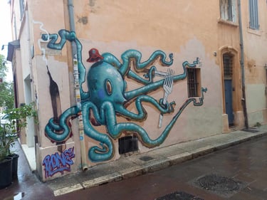 J'étais déjà sous le charme du quartier à peine entré dans les rues, mais mon coup de cœur s'est opéré lorsque j'ai aperçu les multiples œuvres qui en recouvraient les murs ! C'est ce qui fait la beauté du panier, et l'un des coins les plus vivants de Marseille ! C'est aussi le plus vieux quartier de la ville, fondé par les grecs, alors que la cité se nommait Massalia. Un quartier qui a connu des jours sombres, alors centre de la prostitution et dangereux au 19ème siècle, et en 1943, quand les allemands l'ont rasé pour chasser les résistants qui s'y réfugiaient. Depuis les années 1990 / 2000, le panier fut rénové, et est devenu un véritable musée à ciel ouvert, accueillant nombre d'artistes.