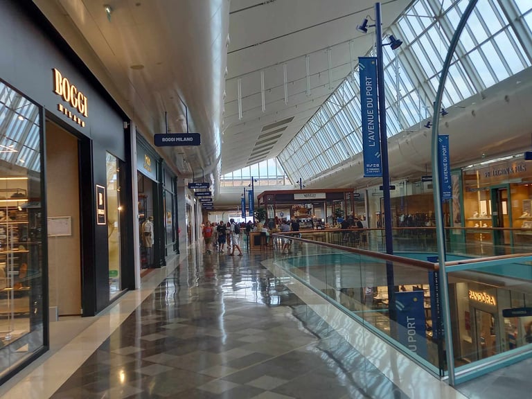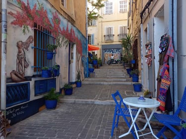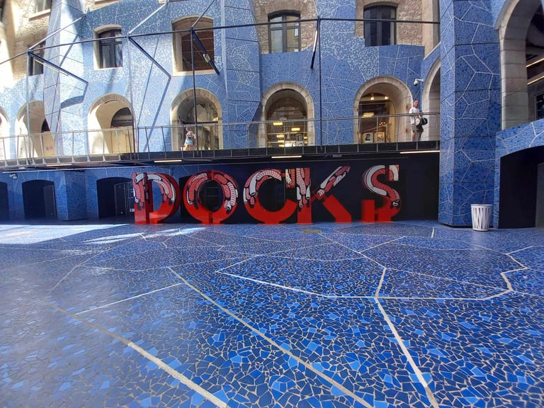Passé le mucem, notre tour nous a conduit aux docks, qui sont devenu une zone commerciale affluente. Je ne suis pas vraiment porté sur la société de consommation, surtout en voyage. Mais qu'importe, nous n'étions pas là pour faire du shoping, mais pour profiter de l'ombre ! Le temps de se poser dans une petite cour bleuté, et nous voilà reparti pour le prochain site, qui lui, est bien plus intéressant qu'un centre commercial.