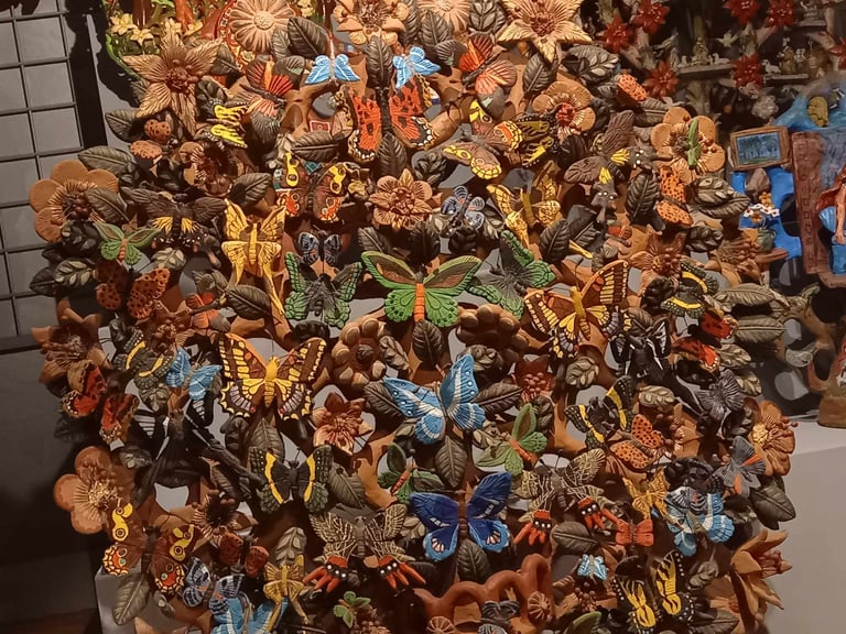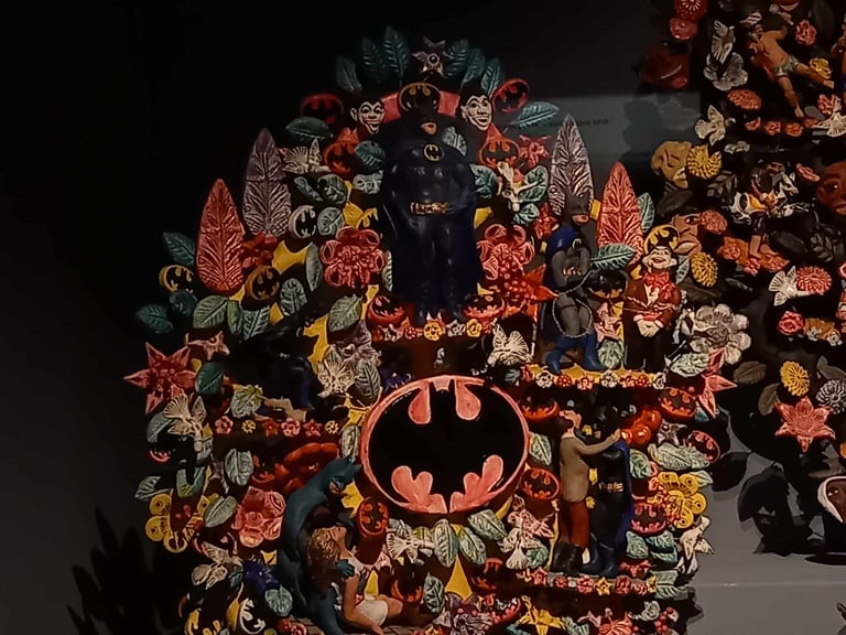 [L'arbre de vie fait partie de la tradition céramique du plateau central du Mexique. Il est d'abord introduit dans les peintures comme un moyen d'évangélisation de la population indigène, Aztèques et Mayas, au cours de la première période coloniale mexicaine. Le peuple mexicain adopte ensuite cette culture et commence à produire des arbres de vie en terre cuite aux couleurs brillantes, chargés de symboles et de représentations. Quel objet d'art et d'artisanat étonnant et prolifique ! Il sait récupérer tous les aspects de la culture du Mexique - jusqu'aux éléments les plus triviaux : images d'humains et d'animaux imaginaires, fleurs, oiseaux, papillons, serpent, fruits, soleil et lune symbolisant le paradis, sombreros, figurines du Christ et de Superman côte à côte, dents de Batman, etc.]